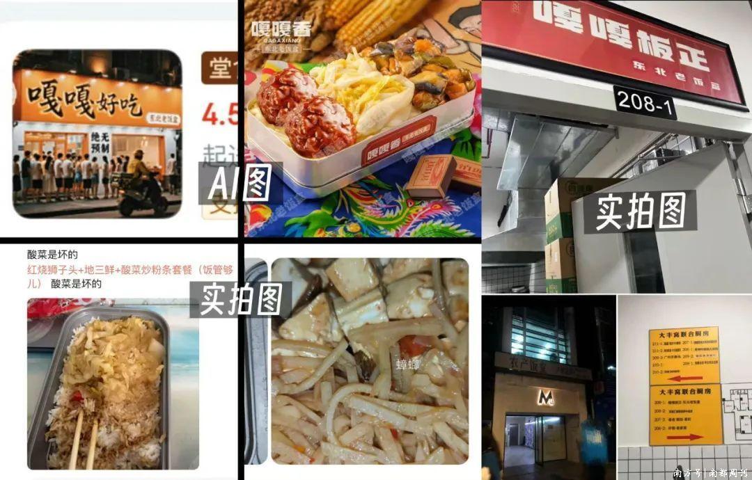 经过在多个平台进行交叉对比后发现,这些使用AI门头照片的商家基本上都是“线上线下两幅面孔”。不同于AI包装图的华丽,现实里,部分商户只是门头简陋、只有粗糙的后厨备餐区、可能只有一两张桌子的小店。有的甚至是无堂食门店,但却用AI生成图伪装成有堂食的餐厅。菜品图也是塑料感满满,和评论区用户晒出来的实物图完全是两副模样。