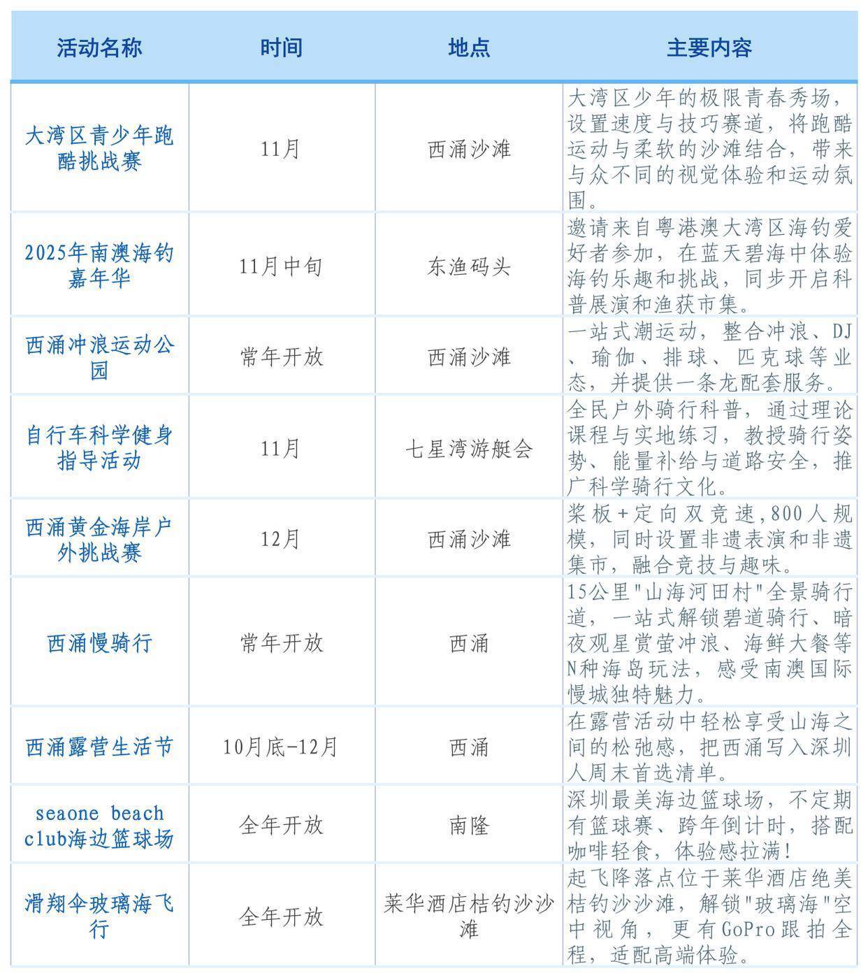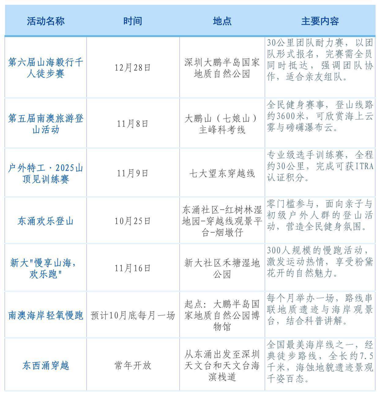 如何在大鹏半岛玩转户外运动?作为大鹏半岛海岸线最长、山海户外运动资源最多、年游客量超800万人次的活力区域,深圳大鹏新区南澳已为你备好惊喜!2025南澳户外运动季重磅推出水上运动、山地越野、综合运动3大类别、25项特色活动,冲浪、徒步、登山、跑酷、骑行、帆船竞速、海上龙舟拔河……从深蓝到山巅,每周都有新亮点、处处藏着新精彩!